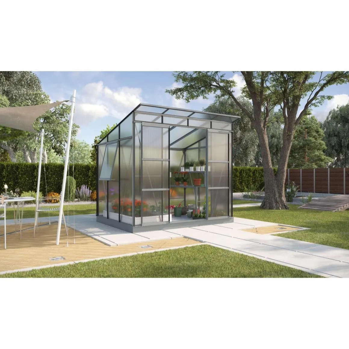 Mit dem Vitavia Gewächshaus Freya 5900 schaffen Sie einen geschützten Raum für Ihre Pflanzen im Garten. Das freistehende Gewächshaus mit einer Grundfläche von ca. 5,9 m² und einem Pultdach bietet ausreichend Platz für die Anzucht von Gemüse, Obst und Blumen.