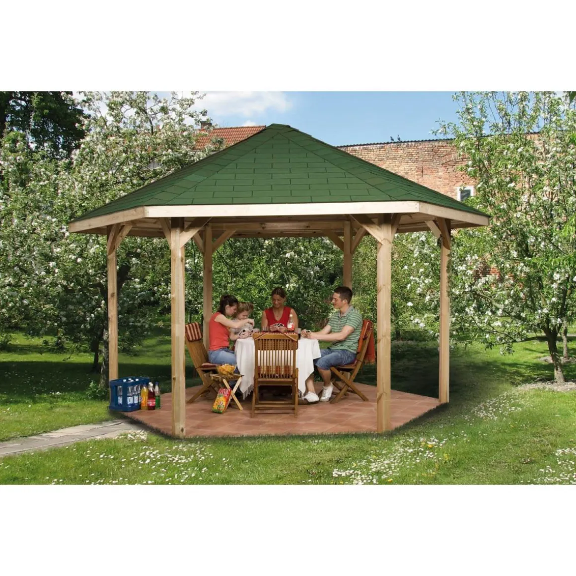 Mit dem Weka Pavillon 656 holen Sie sich ein Stück Natur in Ihren Garten. Das sechseckige Zeltdach und die kesseldruckimprägnierte Kiefer sorgen für eine rustikale Atmosphäre, während das Bitumendachbelag vor Witterungseinflüssen schützt.