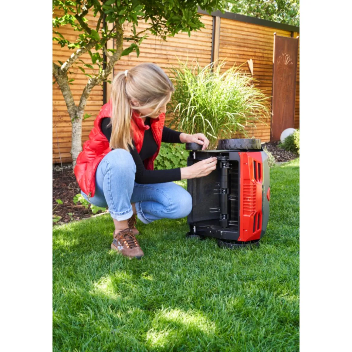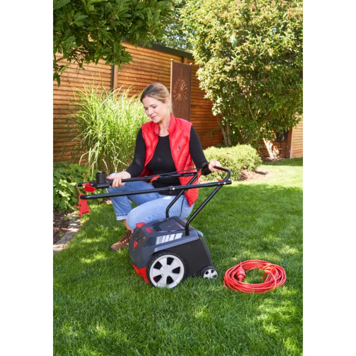 Angetrieben wird der 32.4 Basic Care von einem 1.200 W starken Elektromotor. Dadurch kann der Elektro-Vertikutierer ohne Pause eingesetzt werden und Sie sparen sich das Wechseln eines Akkus bzw. das Tanken des Vertikutierers mit Treibstoff. Mit einer Arbeitsbreite von 32 cm gewährleistet die kompakte Bauweise des Vertikutierers ein angenehmes Arbeiten und dank der 1-Achs-Bauweise gutes Manövrieren in Ecken und um Hindernisse herum. Zentral und stufenlos kann Tiefeneinstellung der Vertikutierwalze vorgenommen werden (+6 bis – 14 mm). Bestückt ist die Vertikutierwalze mit 12 robusten Stahlmessern, die Moos, Unkraut und Rasenfilz nachhaltig entfernen und für eine lange Lebensdauer des Elektro-Vertikutierers sorgen. Die freistehenden Hinterräder verhindern, dass sich Gras absetzt, dadurch erhalten Sie eine bessere Traktion. Mit dabei: Ein 45-l-Gewebefangsack.