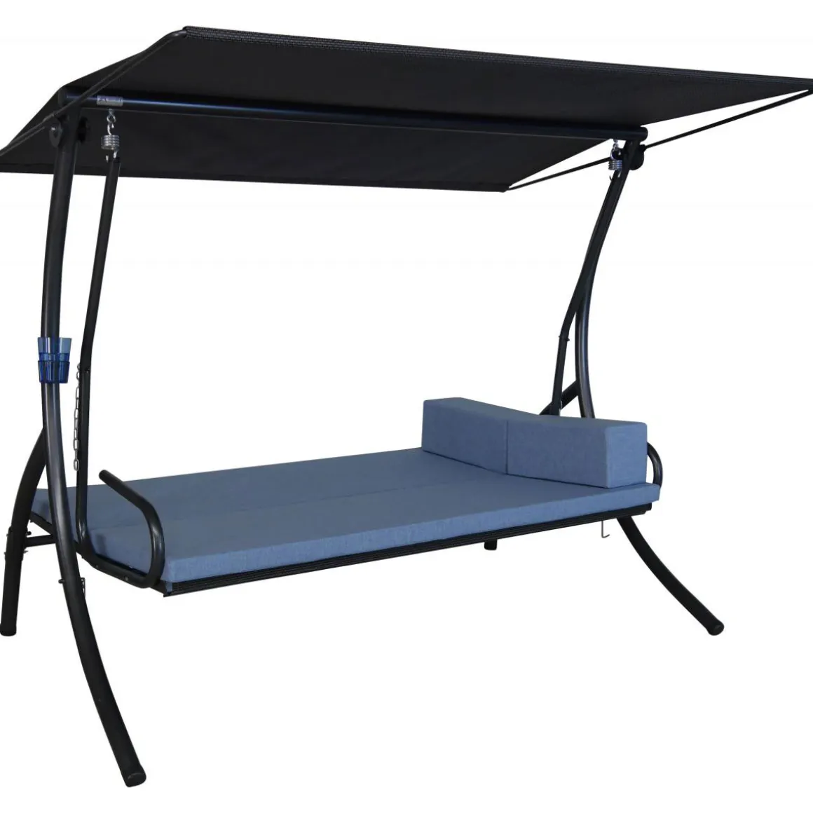 Die 3-Sitzer Angerer Hollywoodschaukel Elegance Tolar in der Farbe blau lässt sich mit wenigen Handgriffen zur bequemen Liegefläche verwandeln. Das wetterfeste Sonnendach ist verstellbar. Die Kissen sind aus einem besonders hochwertigen und angenehmen Stoff gefertigt und lassen sich dank der praktischen Reißverschlüsse einfach abziehen und bei 30° C in der Maschine waschen. Das robuste Gestell der Hollywoodschaukel besteht aus verzinktem und pulverbeschichtetem Stahl.