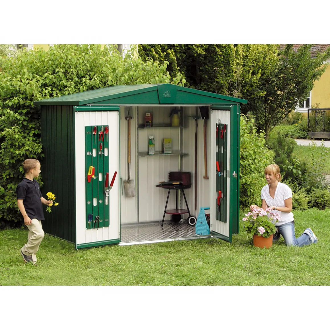 Das Biohort Gerätehaus Europa Größe 3 in dunkelgrün eignet sich ideal für Kunden mit einem großen Garten oder einem größeren Bedarf an Stauraum im Freien. Es bietet genügend Platz für Gartengeräte aller Art sowie Fahrrädern und anderen Utensilien.