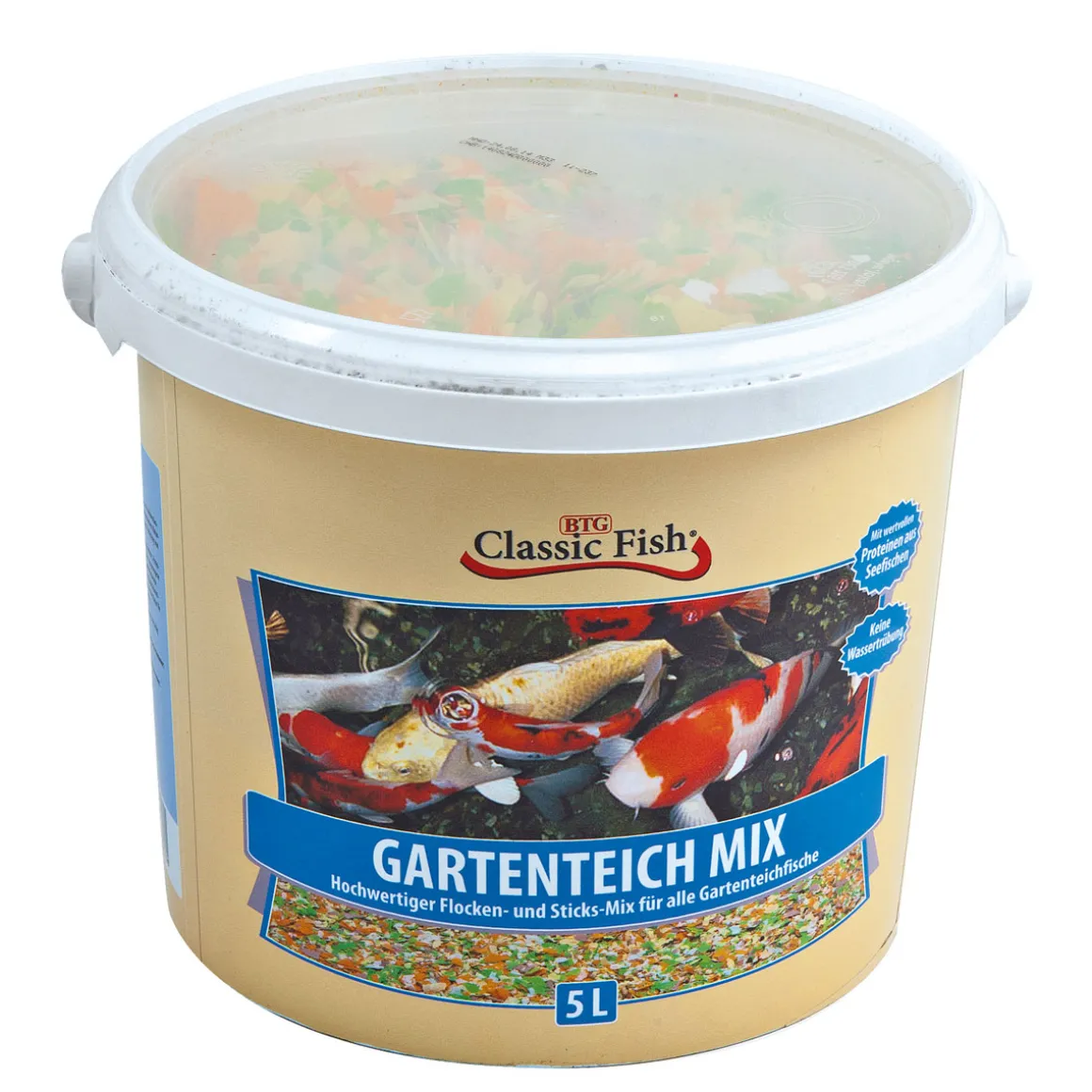 Eine ausgewogene Mischung aus hochverdaulichen Flocken, Sticks und getrocknetem Naturfutter zur abwechslungsreichen Fütterung von allen Gartenteichfischen.