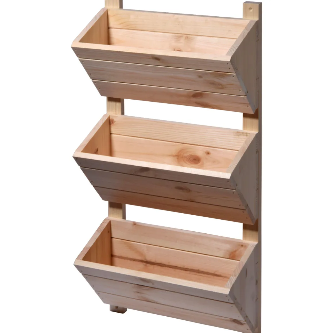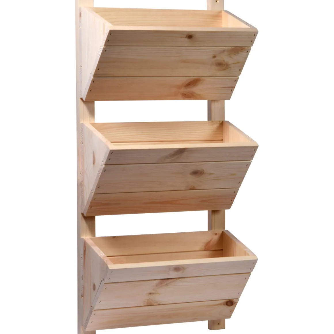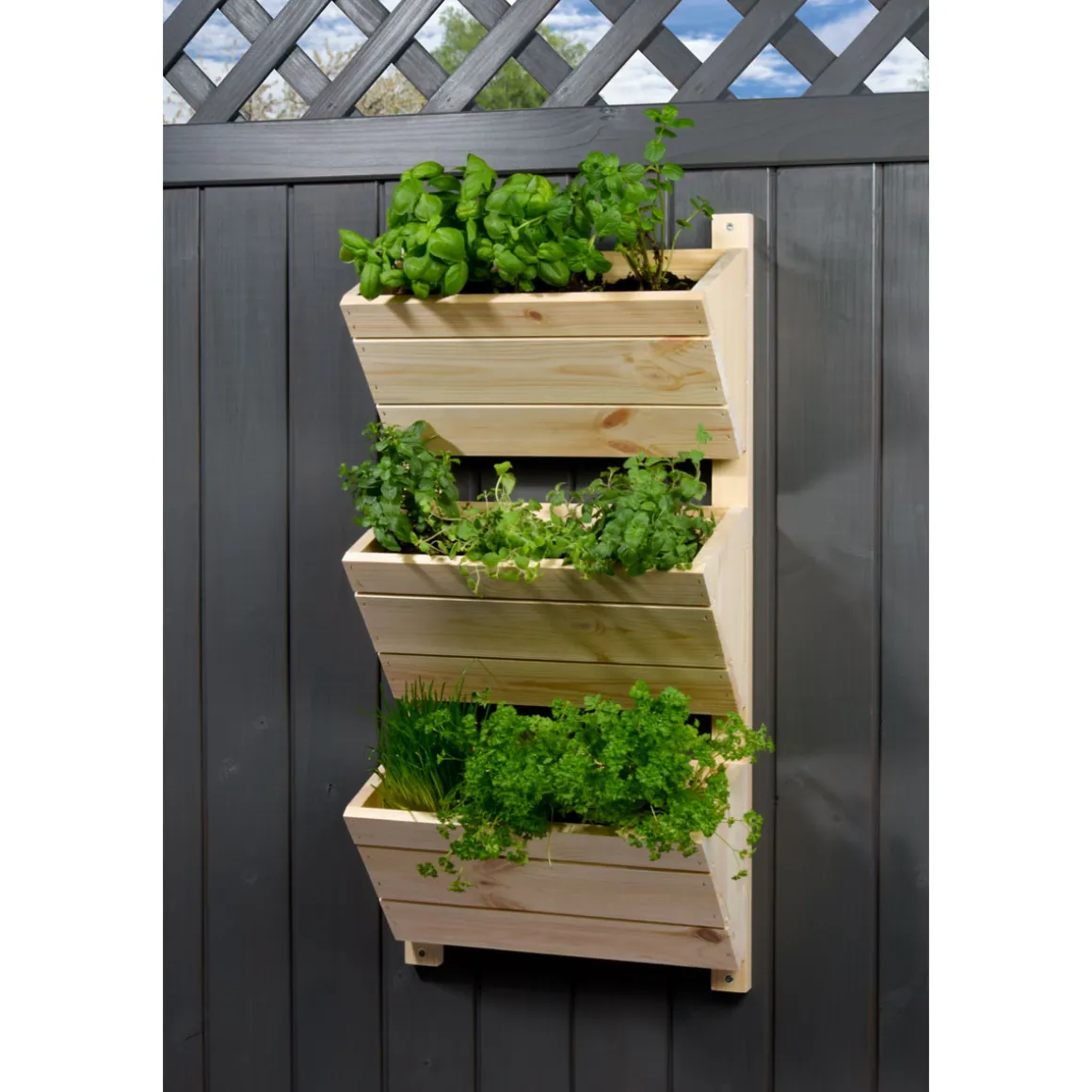 Kompakt, vielseitig einsetzbar und dekorativ: Dieses Wandbeet ist ein echter Alleskönner. Das 3-stufige Vertikalbeet kann in der Küche, auf dem Balkon oder der Terrasse abgelegt werden. In den drei separaten Blumenkästen können Kräuter oder Blumen angepflanzt werden. Optisch begeistert das Stufenbeet durch den natürlichen Holzlook und die reduzierte Formensprache. Da es in Handarbeit gefertigt wurde, handelt es sich um ein echtes Unikat. Das Wandbeet hat die Maße BxHxT 38x79x17,5 cm.