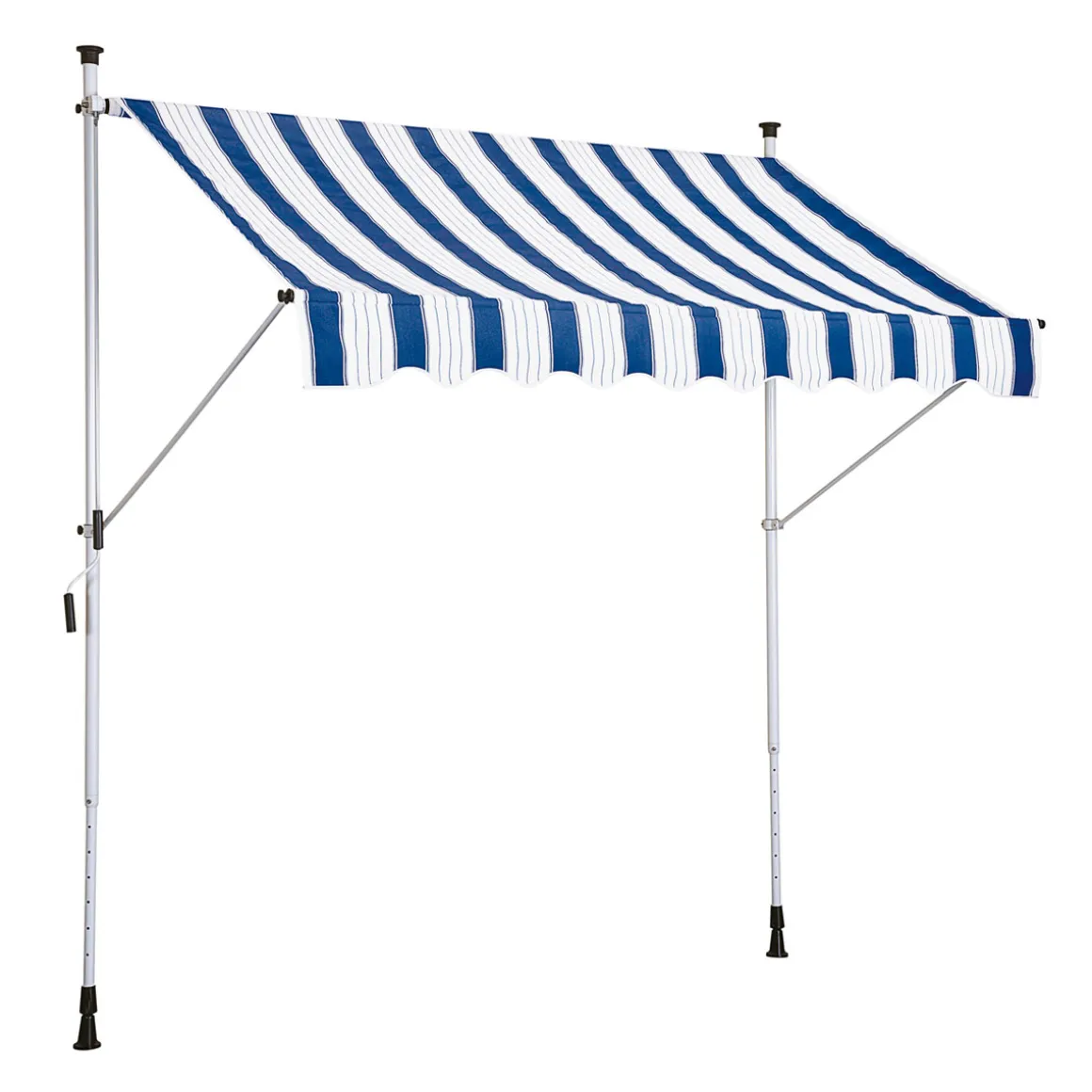 Genießen Sie den Sommer auf Ihrem Balkon oder Ihrer Terrasse mit der Fallarm-/Balkonmarkise Lyon in blau-weiß gestreift. Die manuelle Höheneinstellung von 2-3 m ermöglicht eine flexible Nutzung, während der Polyesterbezug für ausreichenden Schutz vor Sonne und leichtem Regen sorgt.