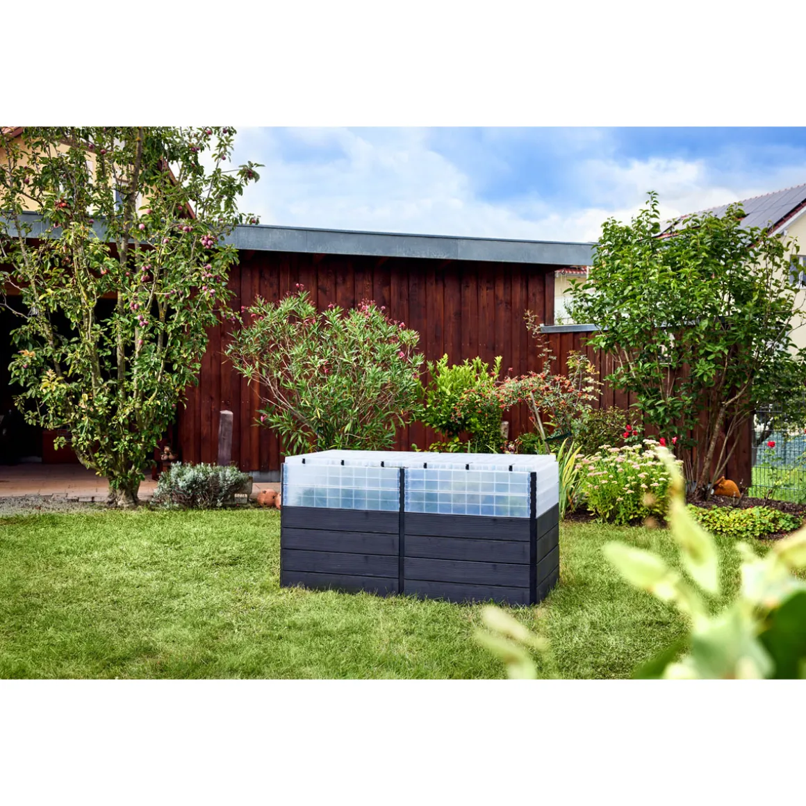 Garantia ERGO Hochbeet QUADRO TurboPlus 2 L 80 – Set bestehend aus 18 Paneelen inkl. Steckverbinder und Frühbeet-Abdeckung. Ergonomisches Arbeiten in bequemer Höhe – jederzeit flexibel erweiterbar. Das ERGO QUADRO Hochbeetsystem ist ein modular konzipiertes Hochbeet und ermöglicht Ihnen den Aufbau eines an Ihre Bedürfnisse und Platzverhältnisse angepasstes Hochbeet. Das QUADRO 2 L bietet mit seiner klassischen Hochbeet-Größe von 160 x 80 cm, die optimale Größe für den Anbau untschiedlichster Pflanzen. Es ergeben sich vielfältige Gestaltungsmöglichkeiten durch die vergrößerte Anbaufläche. Das ERGO QUADRO Hochbeet überzeugt ebenfalls als Blickfang in Ihrem Garten durch die dekorative Oberfläche in 3D-Holzoptik mit originalgetreuer Struktur, moderner Farbgebung, Langlebigkeit und UV-Stabilität. Bereits bei der Entwicklung eines GARANTIA Hochbeets wird sehr viel Wert auf ein nachhaltiges Produktdesign gelegt. Dieses Hochbeet wird unter Einsatz von Recyclingkunststoff hergestellt und ist zu 100 % recycelbar. Im Gegensatz zu Hochbeeten aus anderen Materialien muss das ERGO QUADRO Hochbeet nicht gestrichen oder innen mit teurer Folie ausgelegt werden. Durch das im Lieferumfang enthaltene transparente Wachstumsmodul mit optimaler Lichtdurchlässigkeit schützen Sie nicht nur Ihre Pflanzen, sondern müssen auch auf eine optimale Sonnen- und Wärmenutzung nicht verzichten. Auch die am Rand platzierten Pflanzen bekommen bereits in der ersten Wachstumsphase im Frühjahr die volle Sonneneinstrahlung zu spüren und Sie können die Fläche Ihres Hochbeetes optimal ausnutzen. Die komfortable Wachstumszone Ihres ERGO Hochbeet-Systems wird durch die passende Frühbeet-Abdeckung optimal ergänzt. Gerade die Jungpflanzen werden zuverlässig vor Witterungseinflüssen wie z. B. Kälte, Starkregen und leichtem Frost geschützt und genießen weiterhin die volle Sonneneinstrahlung. Die Frühbeet-Abdeckung mit ihren integrierten Bewässerungsmulden und der individuellen Belüftungsmöglichkeit, schafft Ihnen ein gesundes und schnelles Pflanzenwachstum. Das im Lieferumfang enthaltene FLORA Wassersparsystem führt zusätzlich noch einen reduzierten Wasserverbrauch herbei. Durch die Befüllung mit Kompost und Gartenerde entsteht ein idealer Nährboden für die Pflanzenanzucht. Dank des guten Klimas im Inneren des Hochbeets können Pflanzen schneller reifen – unabhängig von der eigentlichen Bodenbeschaffenheit in Ihrem Garten. Neben Blühpflanzen gedeihen auch viele Gemüsesorten sowie Küchenkräuter und Früchte hervorragend im ERGO QUADRO Hochbeet, eine ertragreiche und gesunde Ernte auf kleinem Raum ist vorprogrammiert. Ungeziefer und Schnecken haben es schwerer die Pflanzen in Ihrem Hochbeet zu erreichen. Dieses Komplett-Set besteht aus insgesamt 18 Paneelen und Frühbeet-Abdeckung, welche durch Steckverbinder einfach und problemlos ohne Werkzeug zusammengesteckt werden. Somit erreicht man eine Höhe von 80 cm und ein Grundmaß von 160 x 80 cm. Qualität Made in Germany. Maße: 160 x 80 x 80 cm (L x B x H).