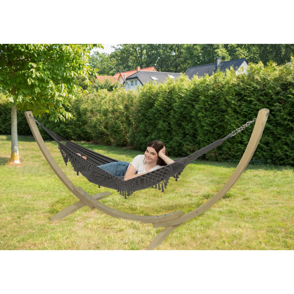 Die Hängematte Galaxy ist perfekt für alle, die sich nach einem stressigen Tag im Garten oder auf der Terrasse entspannen möchten. Mit einer Tragfähigkeit von bis zu 120 kg eignet sie sich auch für Personen mit höherem Körpergewicht.