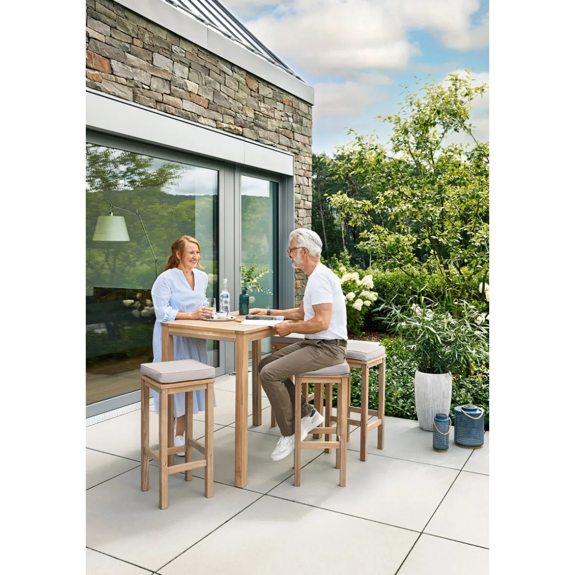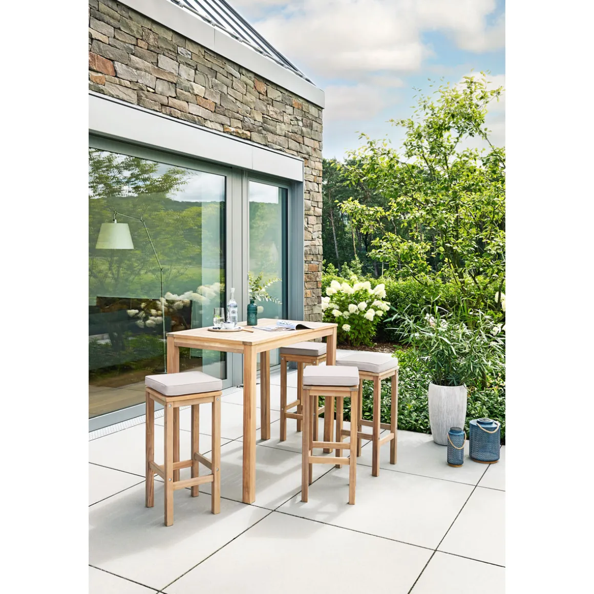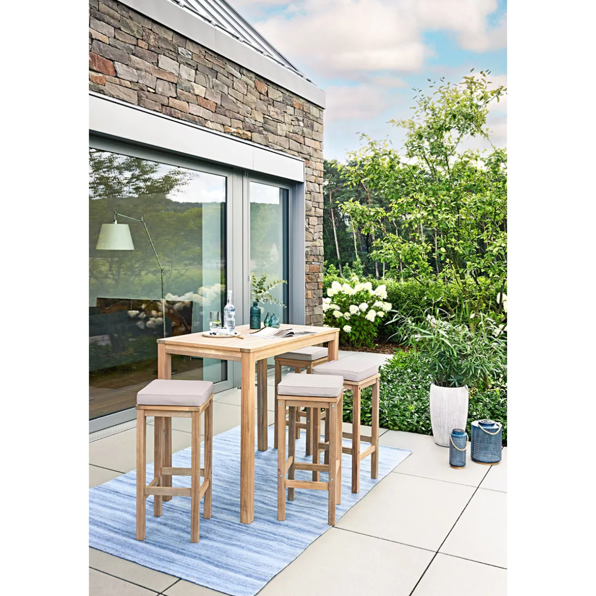 Mit dem Haveson Bar-Set Mykonos holen Sie sich ein Stück Urlaubsfeeling in Ihren Garten. Das Set besteht aus einem Tisch und vier Barhockern, alle aus hochwertigem Akazienholz gefertigt. Die hellgrauen Auflagen sorgen für zusätzlichen Komfort und machen das Set zu einem echten Blickfang.