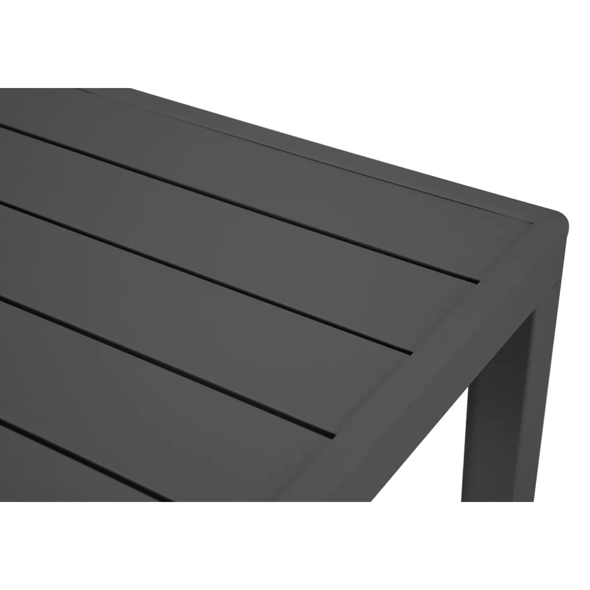 Pulverbeschichtetes Aluminiumgestell anthrazit, bestehend aus Eckbank, BxHxT ca. 238x66x183 cm und Tisch, BxHxT ca. 13x67x73,5 cm, mit Aluminium-Belattung, mit hochwertiger Kissengarnitur aus Strukturpolyester 280 g/m².