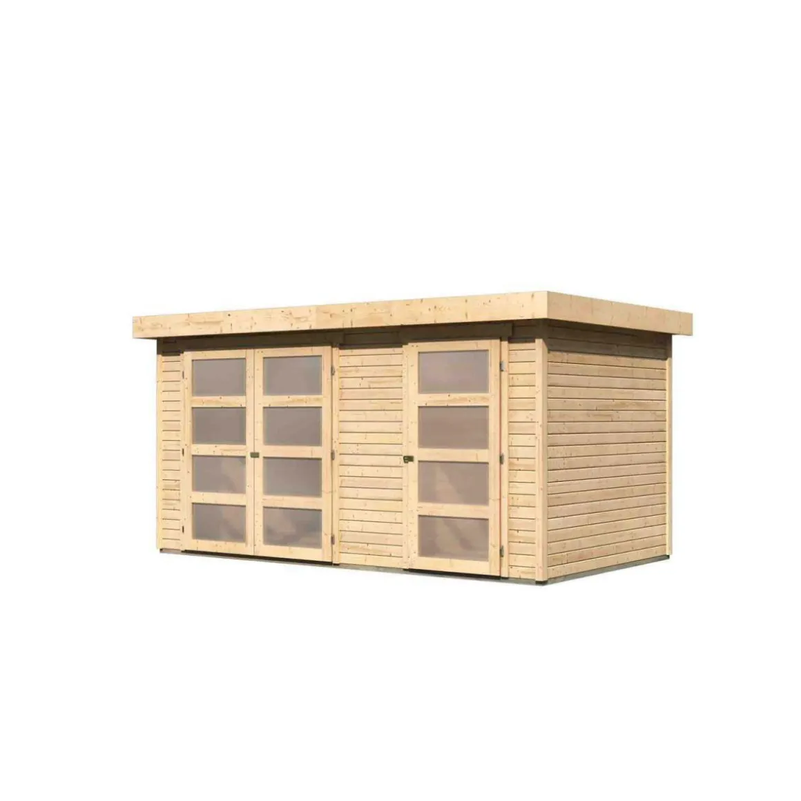 Das Gartenhaus wird aus 19 mm starken Wandbrettern aus nordische Fichte im Steck-/Schraubsystem gefertigt und ermöglicht somit einen einfachen Aufbau. Das Flachdach besteht aus Dachplatte, sodass das Gartenhaus rasch gegen von oben kommende Witterungseinflüsse geschützt ist. Die Grundfläche beträgt 8,52 qm bei einem umbauten Raum von 17 cbm. Mit einer Seitenhöhe von 195 cm und einer Firsthöhe von 211 cm bietet das Gerätehaus optimale Raumnutzung. Das Gartenhaus ohne Anbauten hat ein Sockelmaß von 400 cm x 213 cm. Bodenbalken sorgen für den Schutz von unten und werden unter das Gartenhaus gelegt. Durch die Kesseldruckimprägnierung der Bodenbalken sind diese vor Witterungseinflüssen und holzzersetzenden Pilze bereits geschützt. Die praktische und vormontierte Tür sorgt mit Ihren großzügigen Abmessungen und dem Massivholzrahmen für einen einfachen Zutritt in das Gartenhaus und sichert den Inhalt nebenbei effektiv vor unbefugtem Zugriff. Die Verglasung der Lichtausschnitte sorgt für großzügigen Tageslichteinfall.