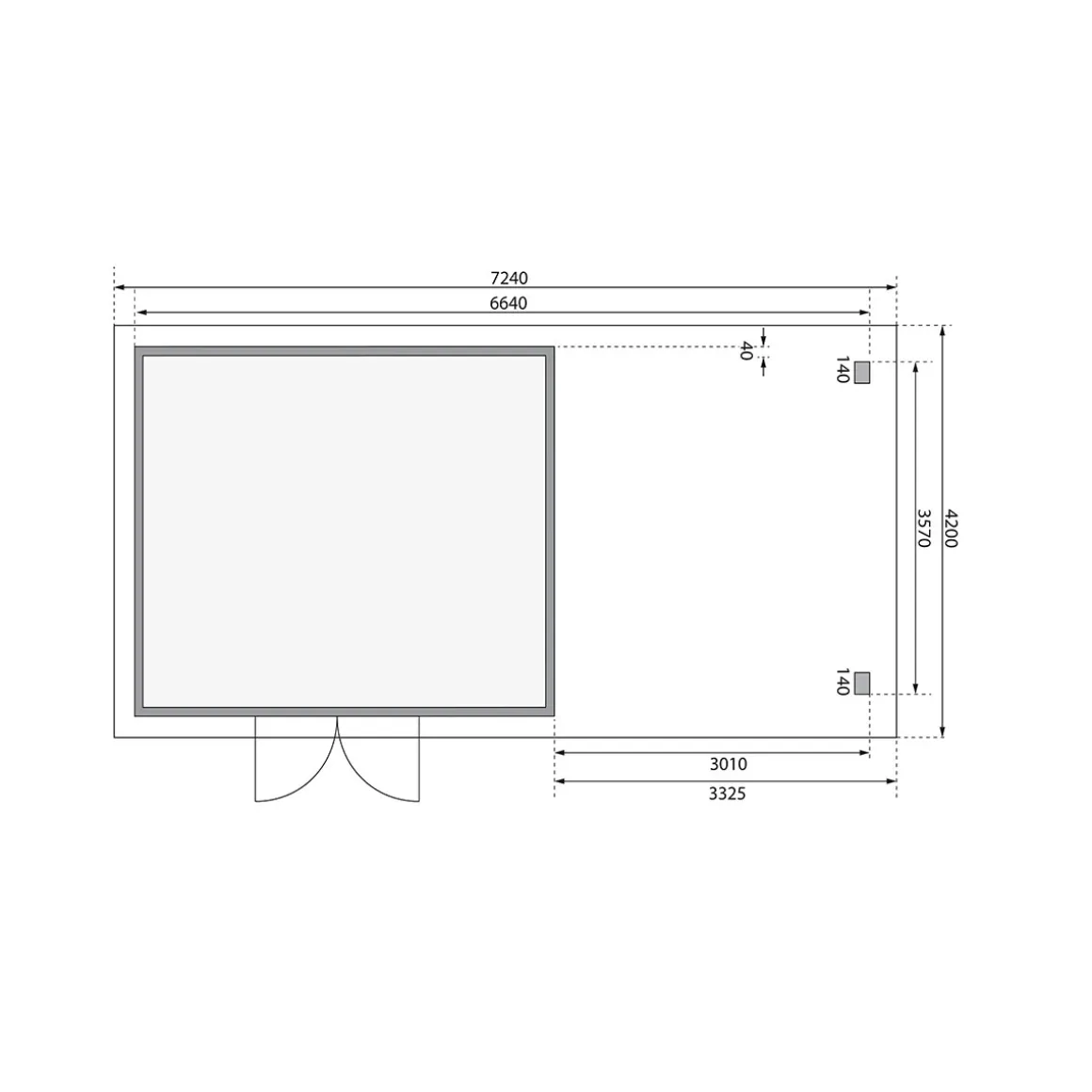 Das Gartenhaus wird aus 38 mm starken Wandbrettern aus nordischer Fichte im Steck-/Schraubsystem gefertigt und gewährleistet somit einen einfachen Aufbau und eine extrem stabile Konstruktion mit doppeltem Nut- und Federbereich der Wandbretter. Das Pultdach besteht aus Massivholzdach. Der vordere Dachüberstand von 205 mm schützt den Eingangsbereich darüber hinaus wirkungsvoll. Die Grundfläche beträgt 13,32 m² bei einem umbauten Raum von 27,7 m³. Mit einer Seitenhöhe von 201 cm und einer Firsthöhe von 229,5 cm bietet das Gartenhaus optimale Raumnutzung. Das Gartenhaus ohne Anbauten hat ein Sockelmaß von 365×365 cm. Bodenbalken sorgen für den Schutz von unten und werden unter das Gartenhaus gelegt. Durch die Kesseldruckimprägnierung der Bodenbalken sind diese vor Witterungseinflüssen und holzzersetzenden Pilzen bereits geschützt. Die praktische und vormontierte Tür sorgt mit Ihren großzügigen Abmessungen und dem Massivholzrahmen für einen einfachen Zutritt in das Gartenhaus und sichert den Inhalt nebenbei effektiv vor unbefugtem Zugriff. Die Verglasung der Lichtausschnitte sorgt für großzügigen Tageslichteinfall.