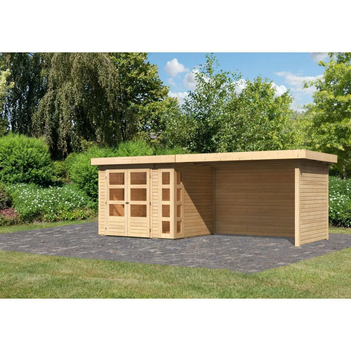 Karibu Gartenhaus-Set Kerko 3 mit Anbaudach 2,8 m mit Seiten- und Rückwand naturbelassen