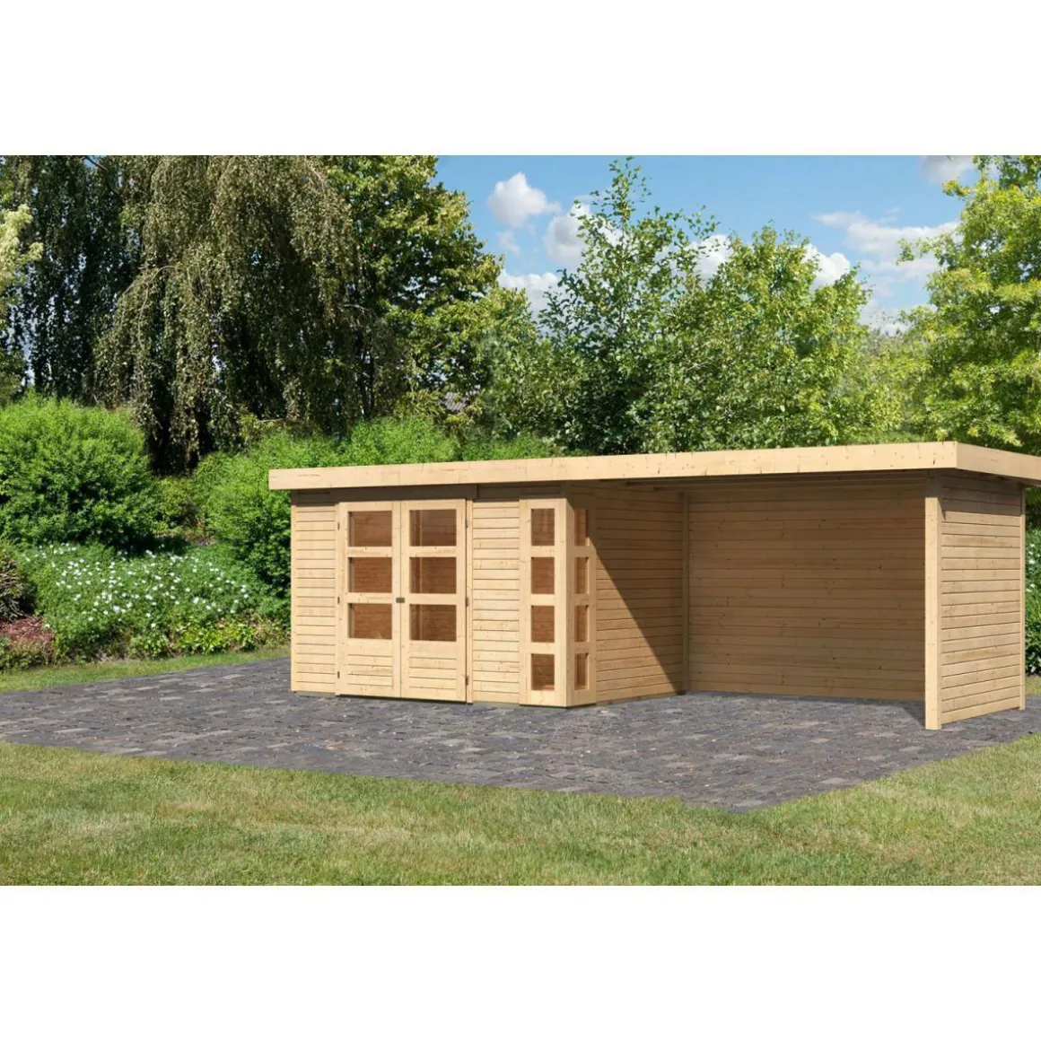 Karibu Gartenhaus-Set Kerko 4 mit Anbaudach 2,8 m mit Seiten- und Rückwand naturbelassen