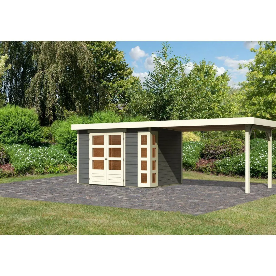 Karibu Gartenhaus-Set Kerko 4 mit Anbaudach 2,8 m terragrau