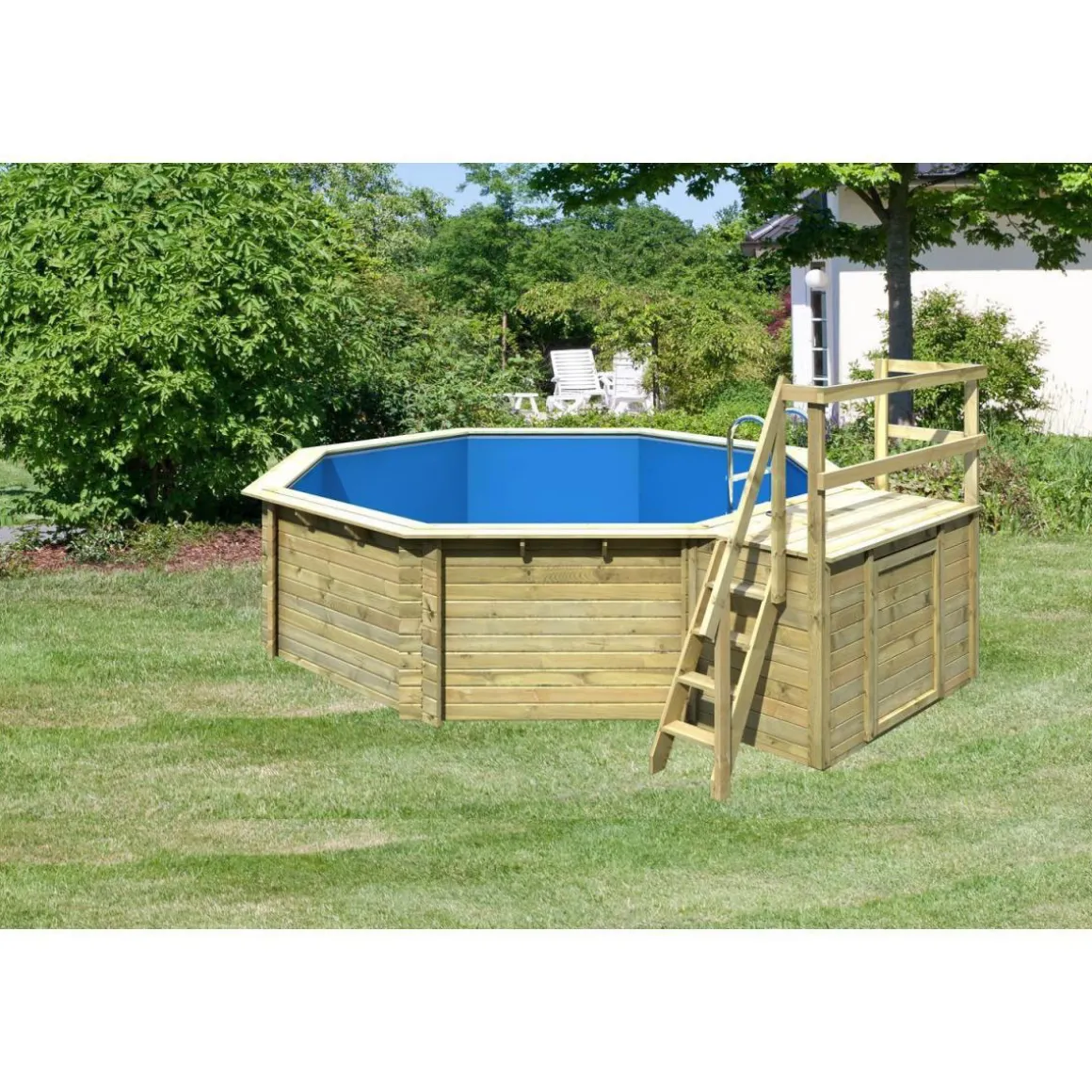 | Lieferumfang: | Pool, Folie, Edelstahl-Leiter, Holzleiter, Einhängebiese, Unterlegvlies, Terrasse mittig, Geländer |