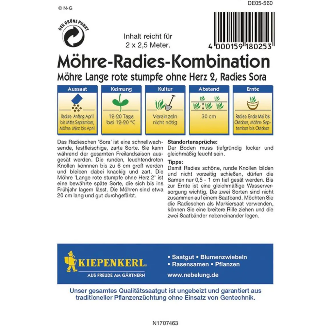 Erleben Sie die perfekte Kombination aus knackigen Radieschen und saftigen Möhren. Das Kiepenkerl Saatband/Kombination Radieschen Möhren o Herz 2 ist ideal für Ihren Nutzgarten und lässt sich einfach anwenden.