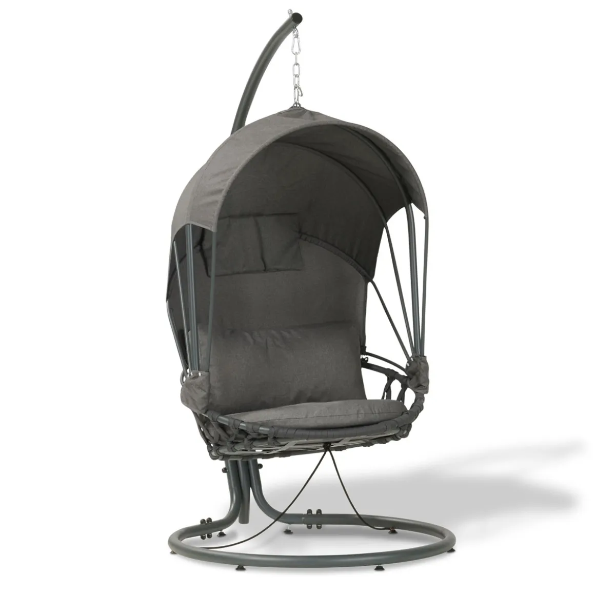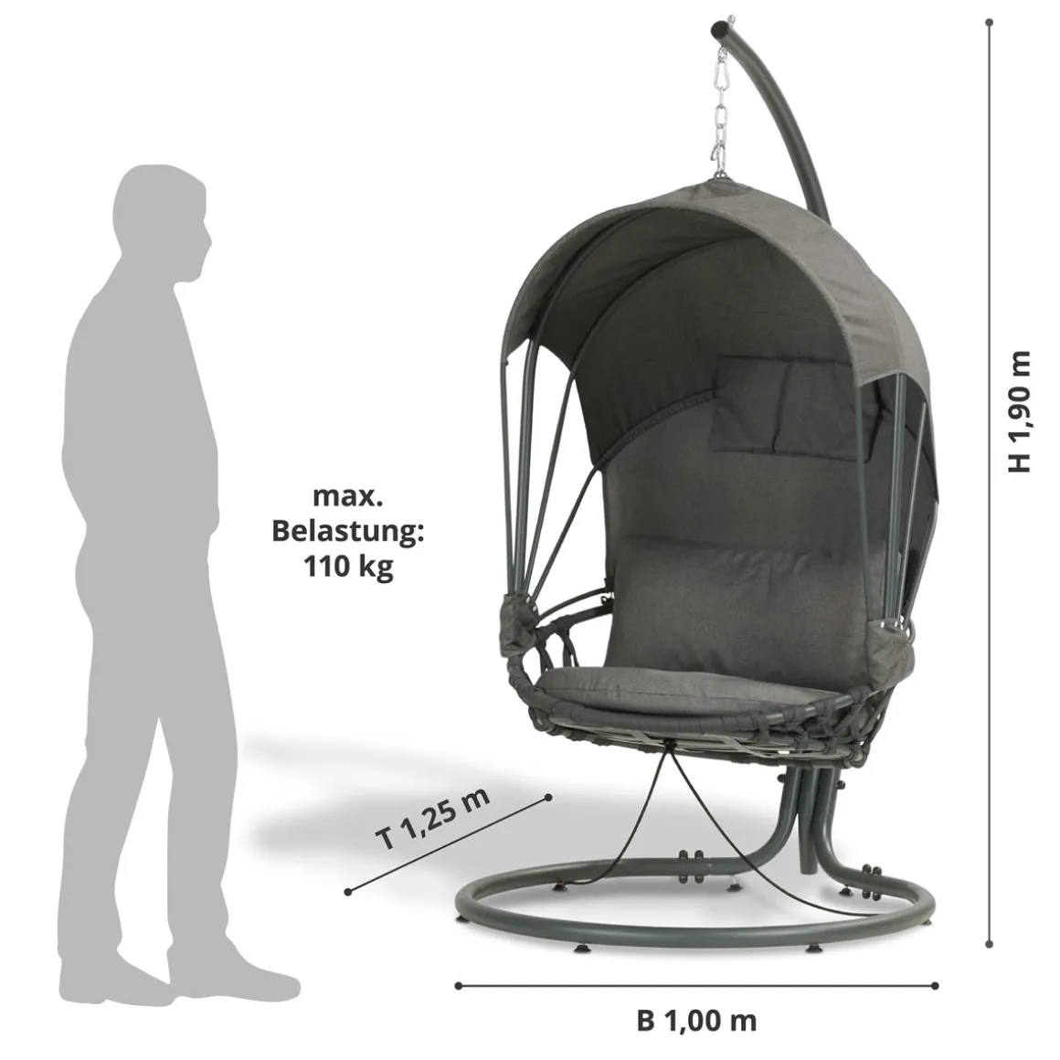 1 x Hängesessel inkl. Polsterkissen (Rücken-, Kopf-, Sitzpolster); 1 x Gestell plus Aufhängung; Montageanleitung