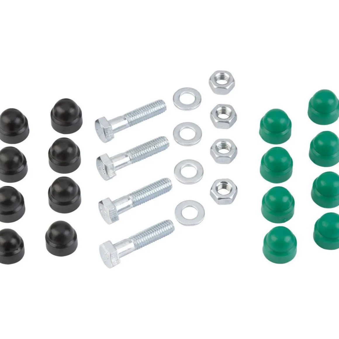 - – Lieferumfang: 4x Schraube, 4x Mutter, 8x Abdeckkappe schwarz, 8x Abdeckkappe grün