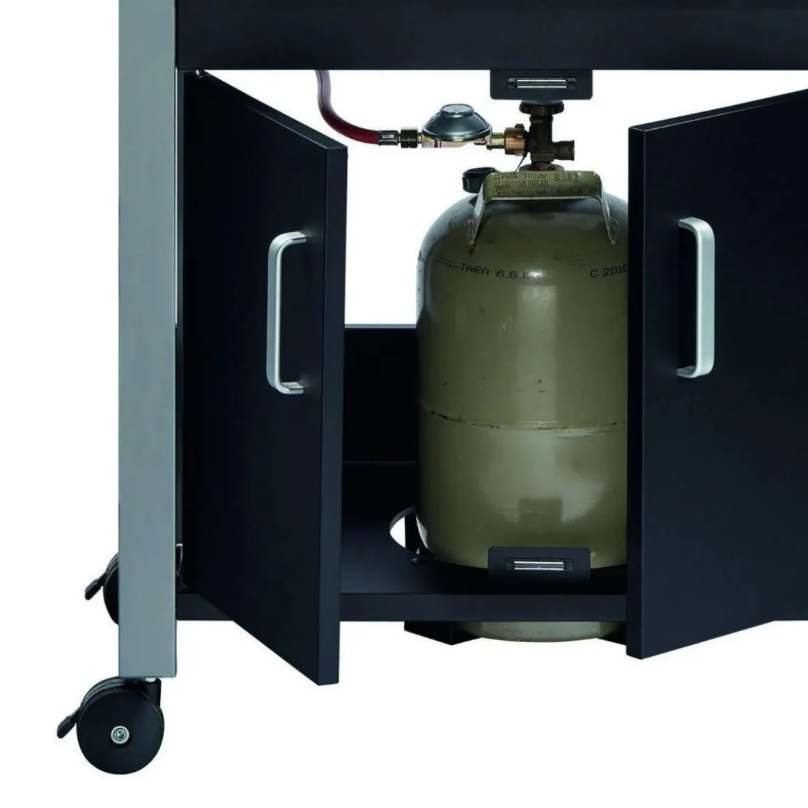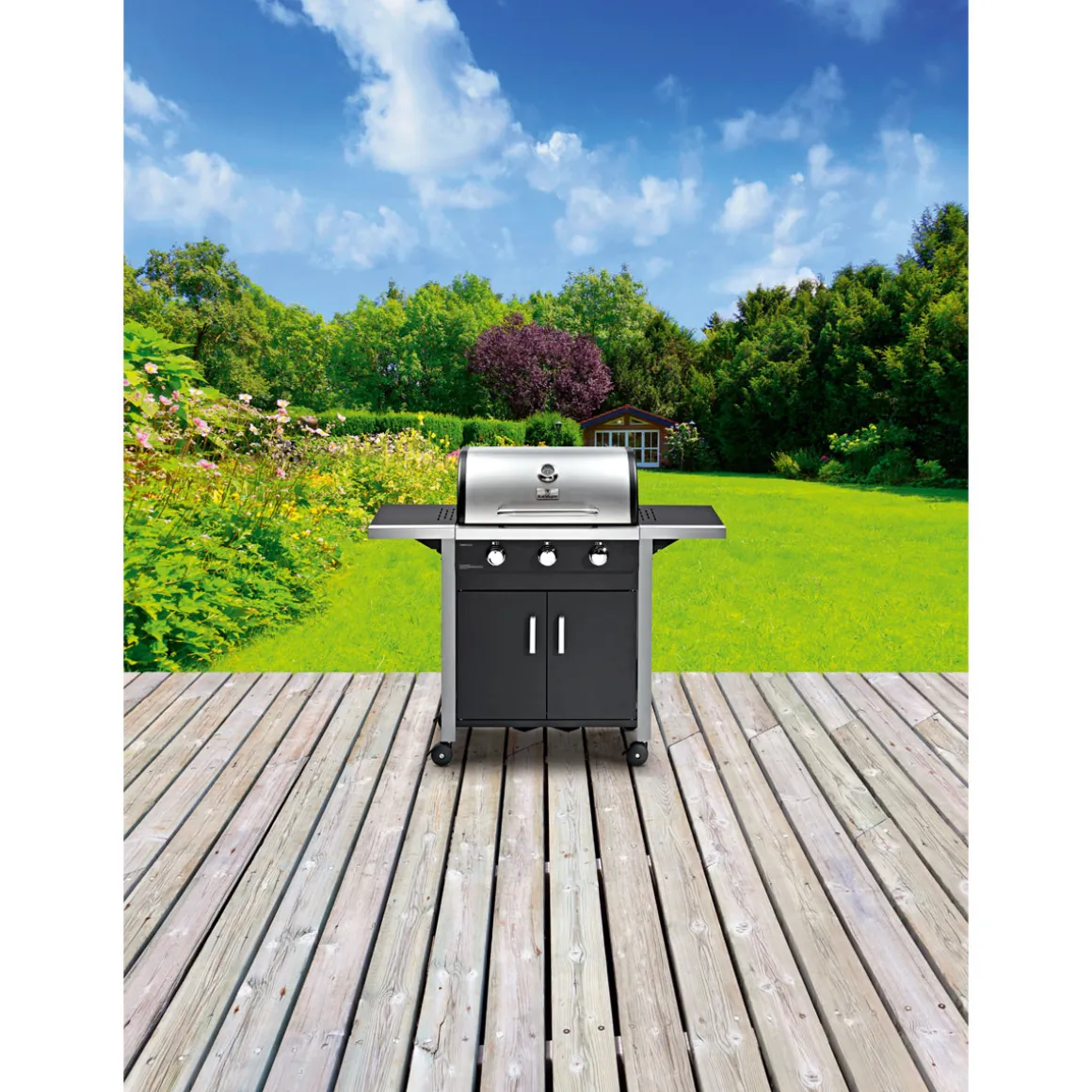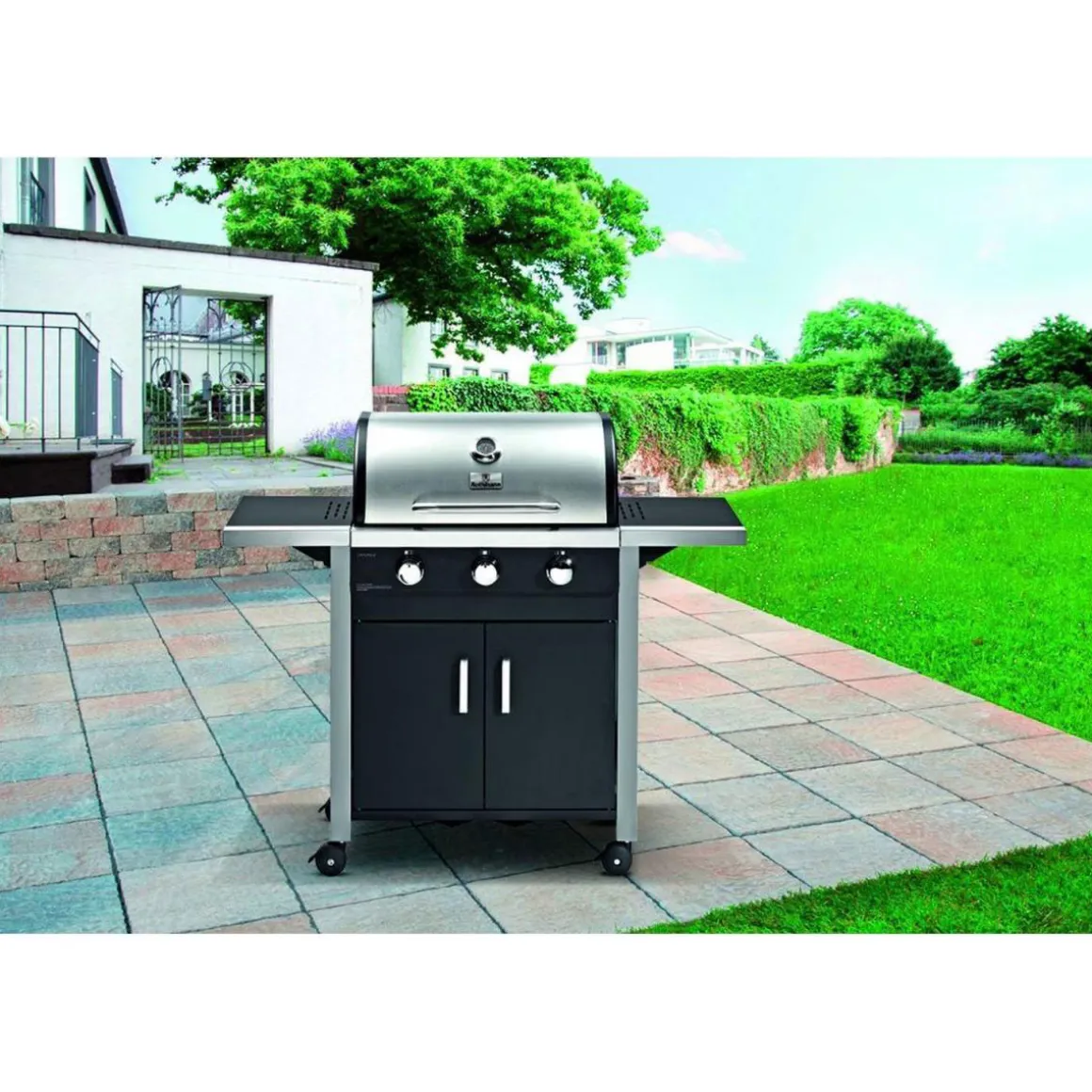 - 3 Edelstahlbrenner mit je 3,2 kW Leistung sorgen für schnelles Aufheizen und eine gleichmäßige Hitzeverteilung auf der gusseisernen Grillfläche.