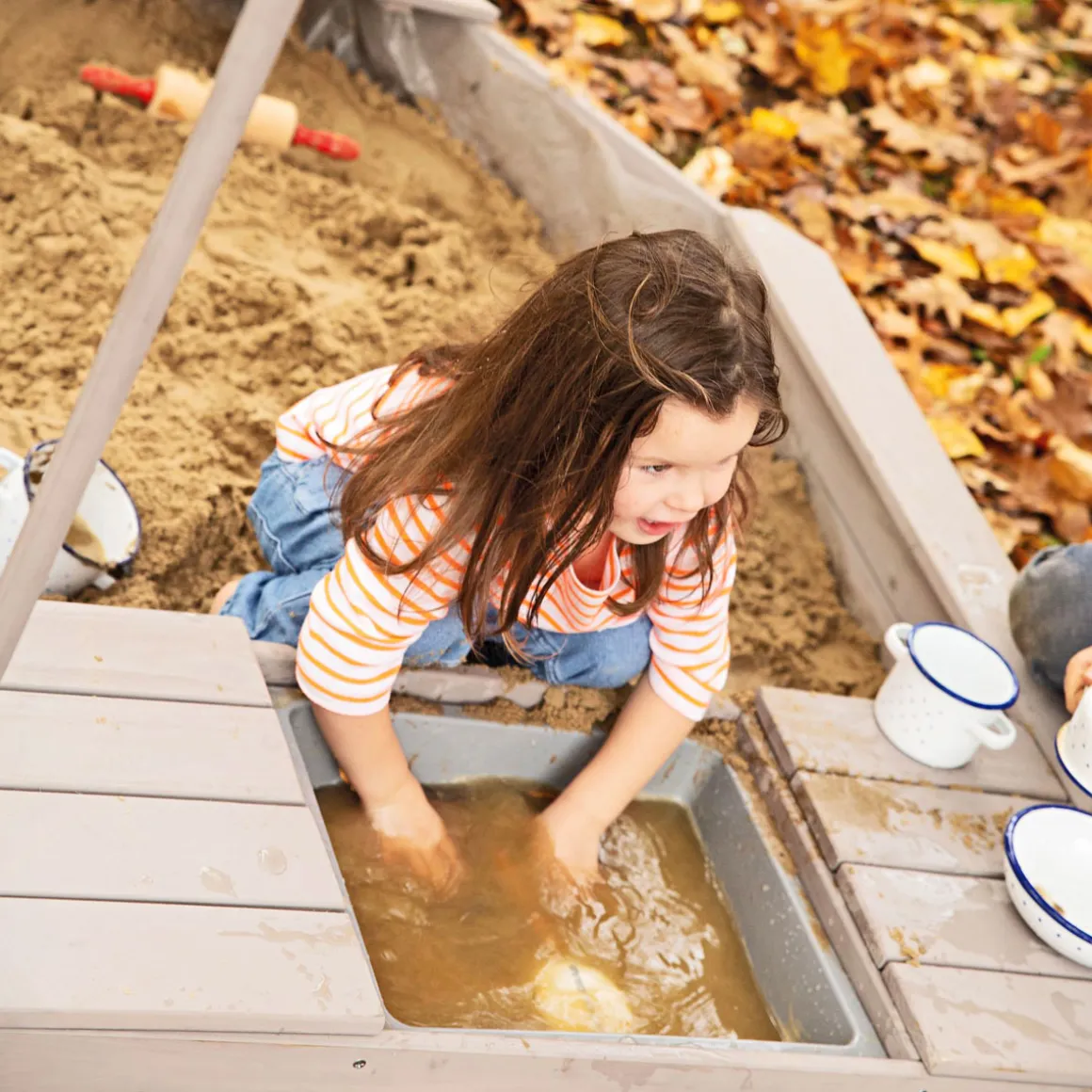 - Witterungsbeständiges Material sorgt dafür, dass der Sandkasten bei jedem Wetter draußen bleiben kann.