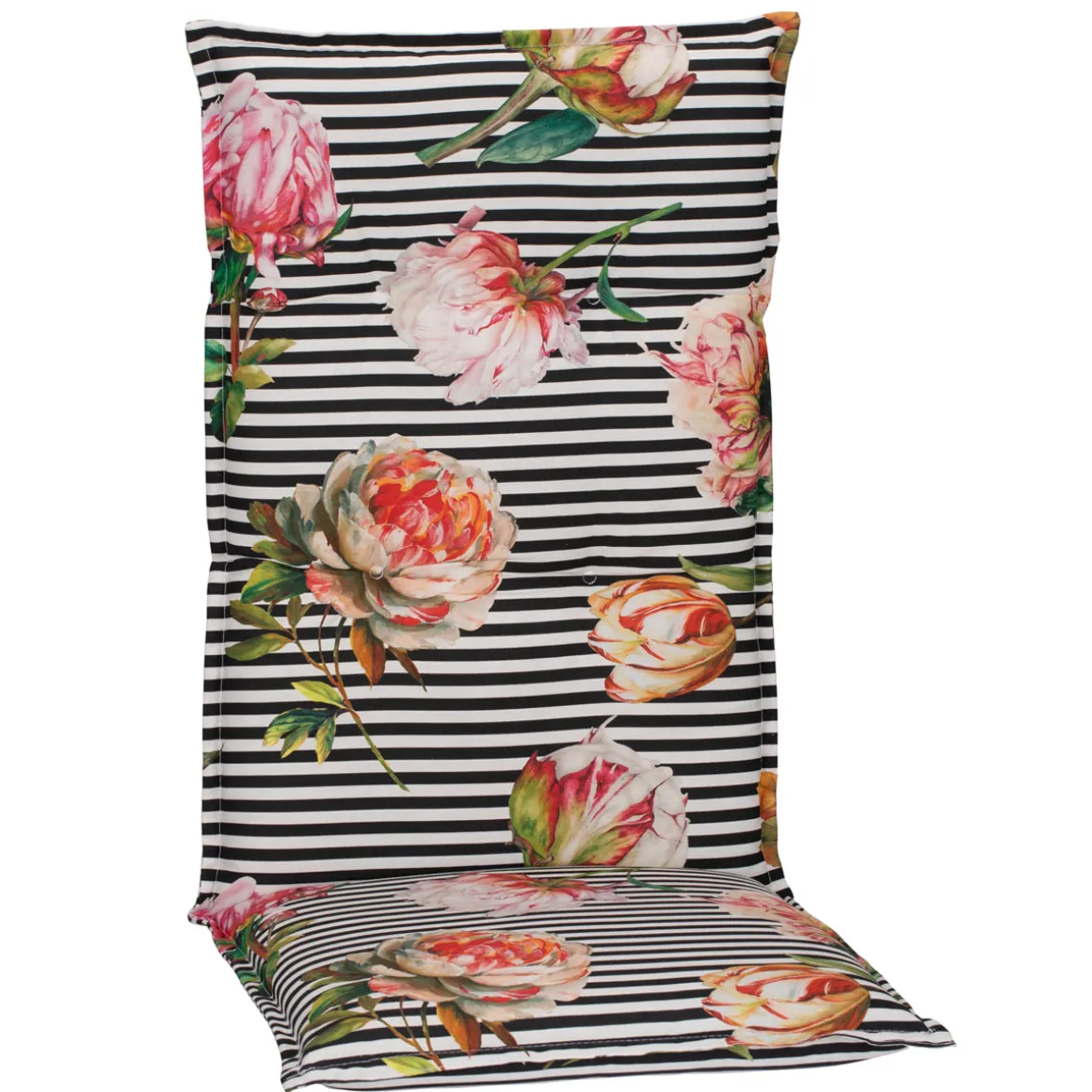 Bringen Sie mit der Saumauflage Toronto BE129 Hochlehner ein Stück Sommer in Ihr Zuhause! Das bezaubernde Design aus roséfarbenen und pinken Pfingstrosen auf stilvollen schwarz-weißen Streifen sorgt für eine elegante und frische Atmosphäre, die jeden Raum oder Außenbereich verschönert. Mit einer Stärke von 8 cm bietet dieses Sitzkissen nicht nur optischen Genuss, sondern auch erstklassigen Komfort – perfekt für lange Stunden im Garten oder gemütliche Abende auf Ihrem Lieblingsstuhl.