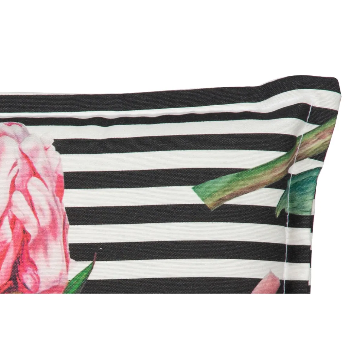 - Hochwertiger Stoffbezug aus Baumwoll-Mischgewebe mit dekorativem Blumen-Print auf schwarz-weißen Streifen