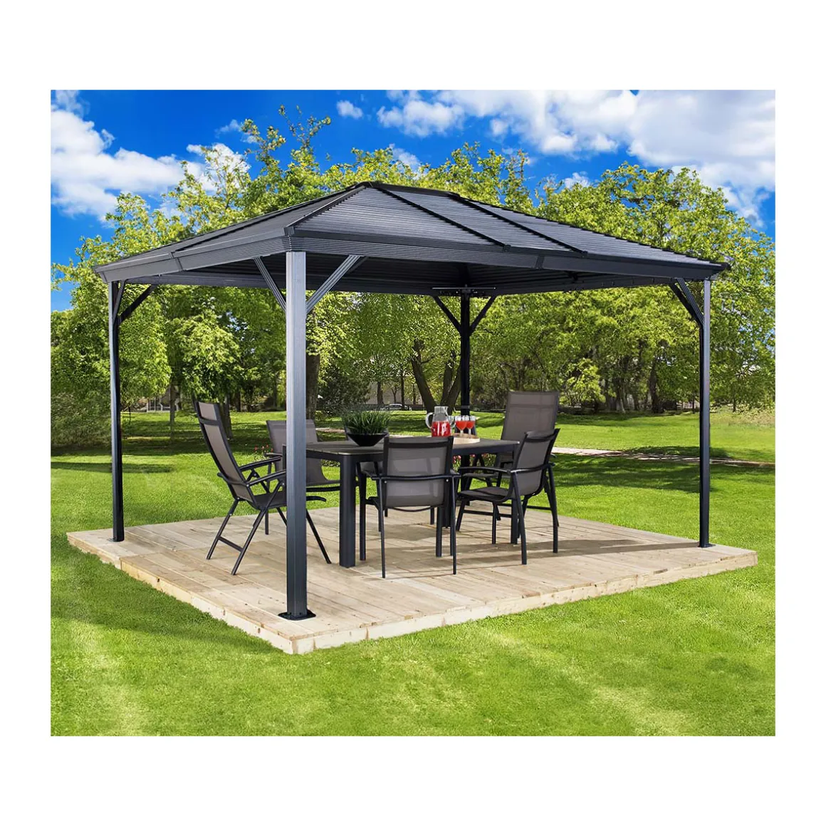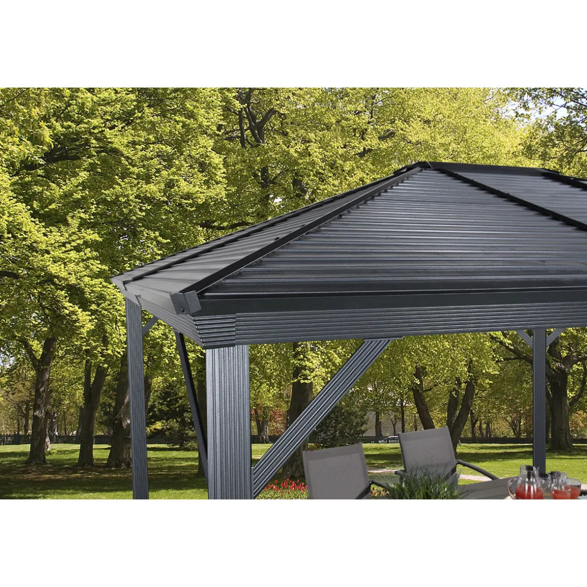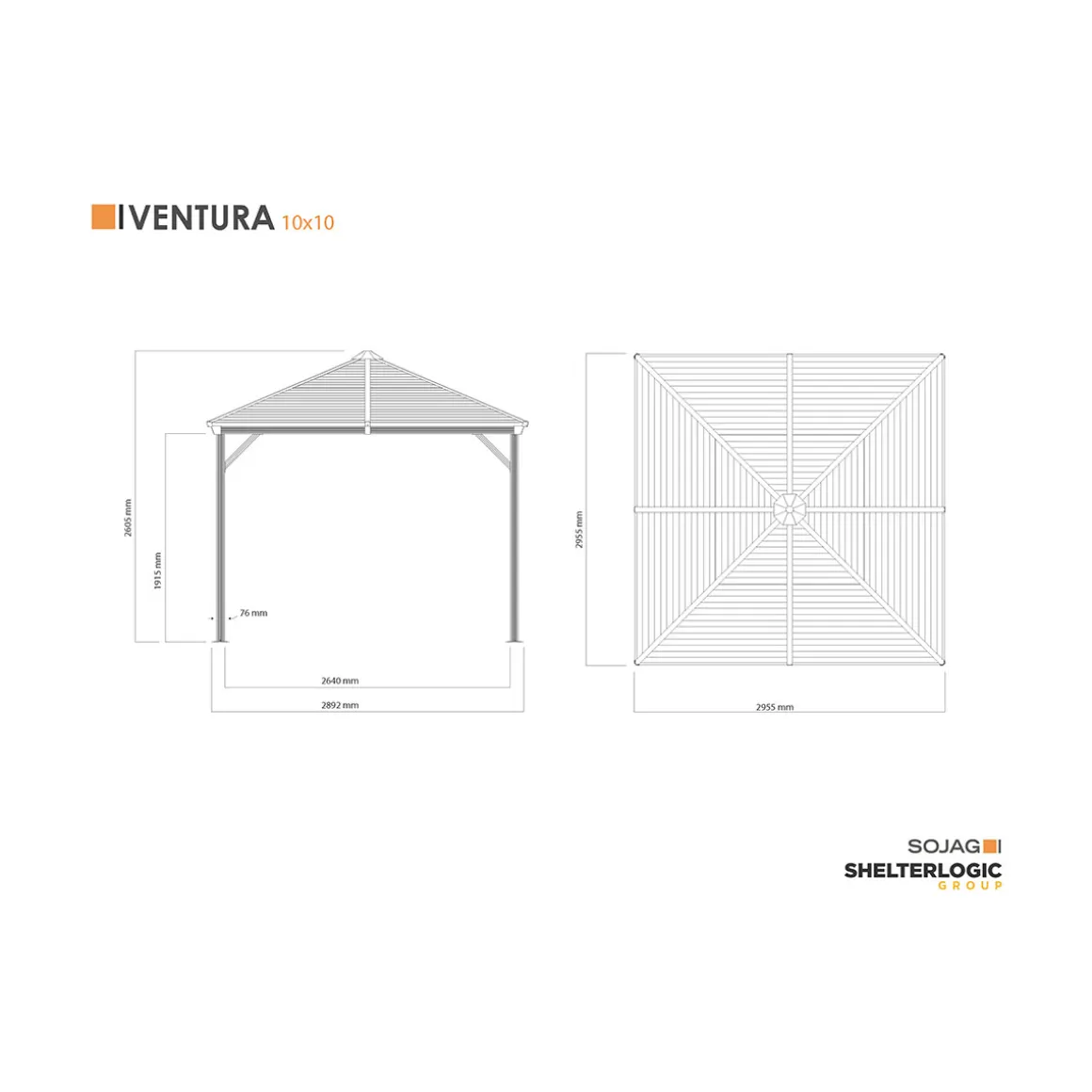 Kanadas Nr. 1 in Pavillons SOJAG Premium Aluminium Pavillon Ventura 10×10 mit Hard-Top Modern, langlebig und eine tolle Optik sind Merkmale der neuen Aluminiumpavillons vom größten und bekanntesten kanadischen Pavillon Produzenten SOJAG. Der wesentliche Unterschied zu anderen Pavillons liegt im Material des Daches. Hier wird anstelle von Kunststoffplatten oder Stoff langlebiger und ständig formschöner Stahl verwendet. Außergewöhnliche 125kg/m² Schneelast und 100% dauerhaft rostfrei! Durch die galvanische Beschichtung rostet das Dach nicht, ist zudem wasserdicht und hält Witterungen wie Regen, Schnee oder Sonne problemlos Stand. Das gleiche gilt für die massive Konstruktion aus resistentem, pulverbeschichtetem Aluminium (Pfostenstärke 7,6cm). Selbst die Schrauben bestehen aus rostfreiem Edelstahl. Der Pavillon muss daher im Winter nicht abgebaut werden. Das Modell Ventura ist in einem edlen Basaltgrau gehalten. Optisch passende Vorhänge (Dunkelgrau) sind seperat erhältlich. Der Aufbau ist unkompliziert und kann durch 2 Personen mit Hilfe der detaillierten Schritt-für-Schritt Anleitung sowie handelsüblichen Werkzeugen durchgeführt werden. Für den Aufbau sollten circa 4-5 Stunden eingeplant werden. Die Füße der Pfosten besitzen jeweils 3 Bohrungen. Das bedeutet, Sie benötigen zur Befestigung am Boden 12 Schrauben und Dübel. Als Untergrund für den Pavillon empfehlen wir eine ebene Fläche aus Holz, Beton oder Pflastersteinen. Ein Schraubenkit zur Verankerung am Boden wird nicht mitgeliefert.