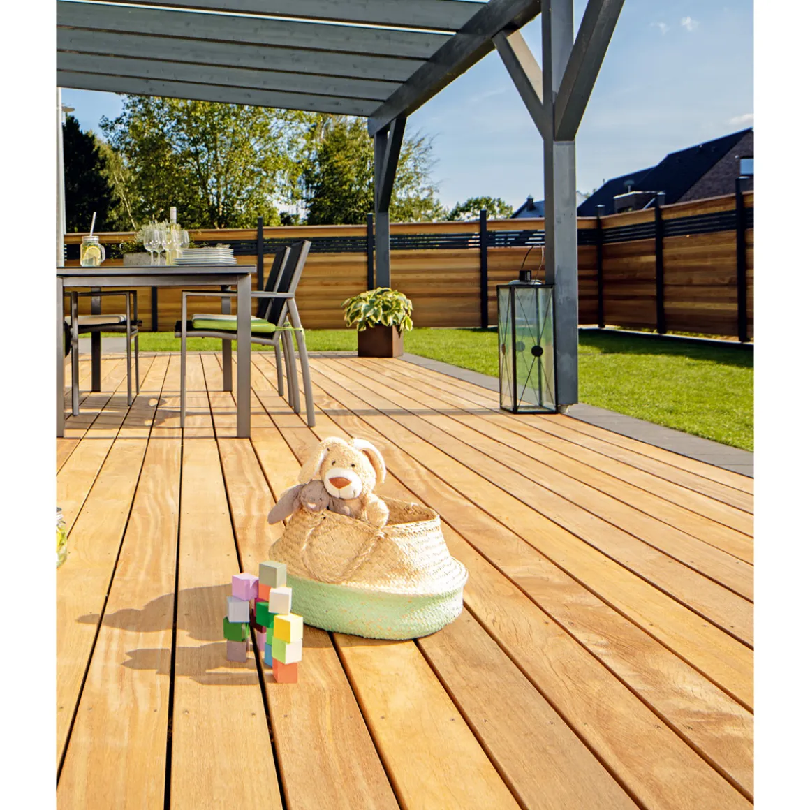 Mit der Terrassendiele Cumaru holen Sie sich ein robustes und langlebiges Material auf Ihre Terrasse. Das beige Holz ist genutet und geriffelt und lässt sich endlos verlegen.