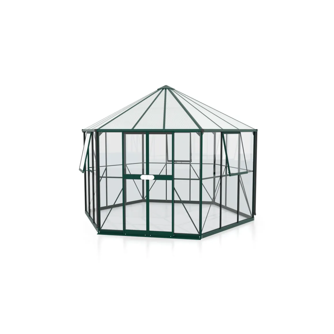 Mit dem Vitavia Gewächshaus Pi erhalten Sie ein hochwertiges und geräumiges Freistehgewächshaus, das sich perfekt für die Pflanzenzucht eignet. Das Gewächshaus ist aus robustem Aluminium gefertigt und verfügt über eine stabile Konstruktion. Mit einer Grundfläche von 12,878 m² bietet es ausreichend Platz für Ihre Pflanzen.
