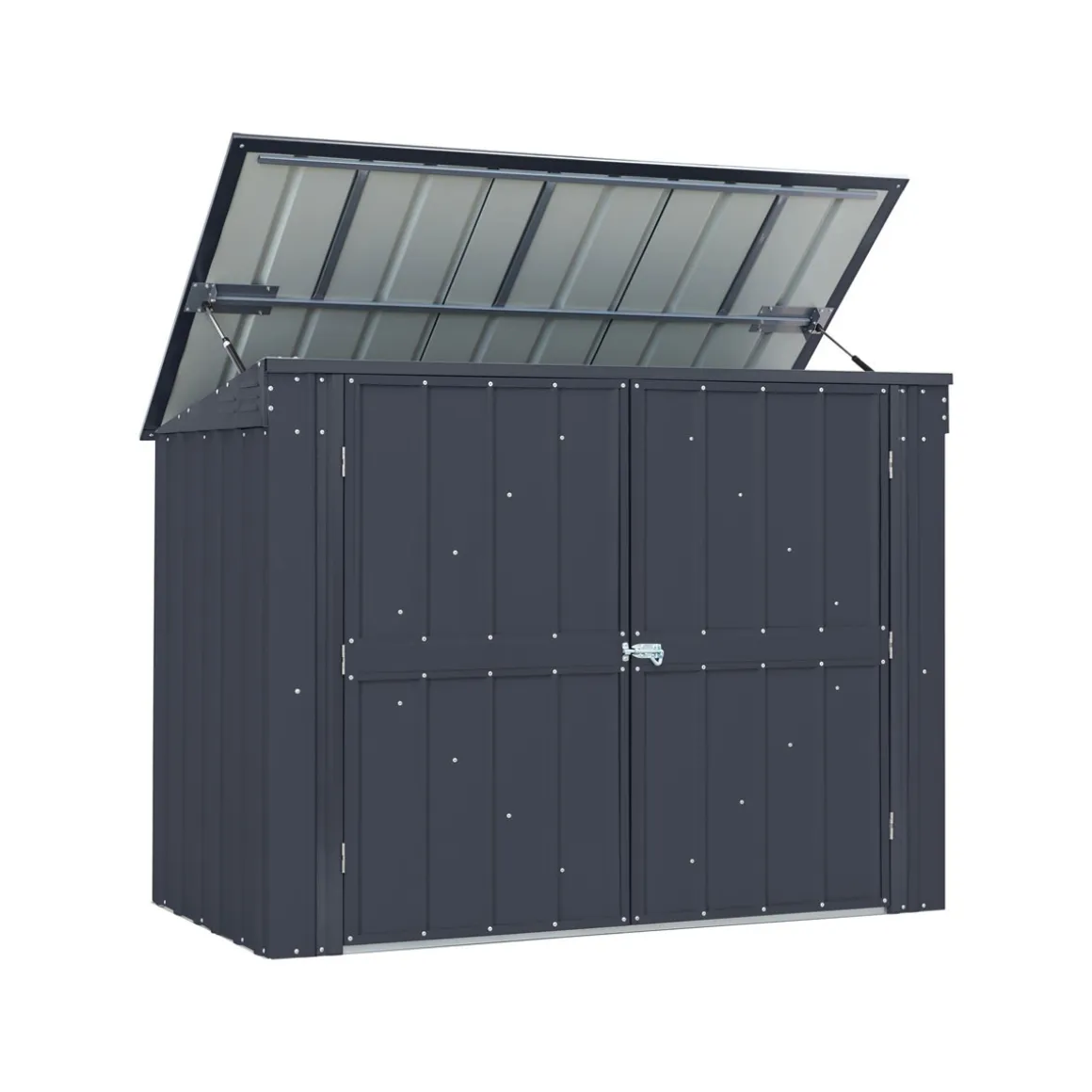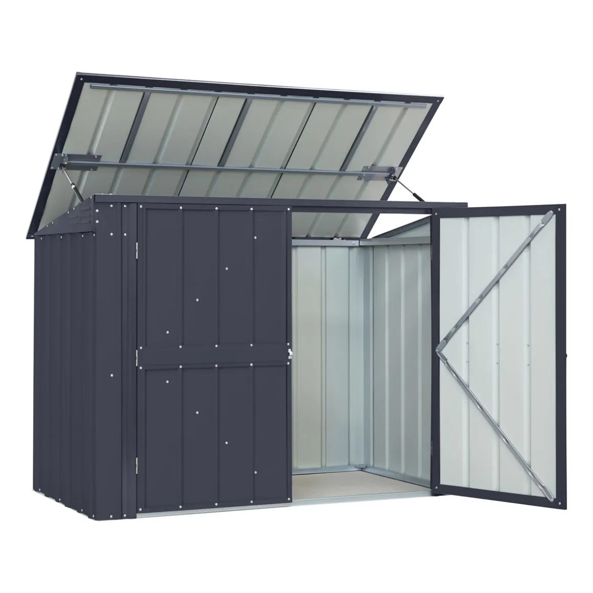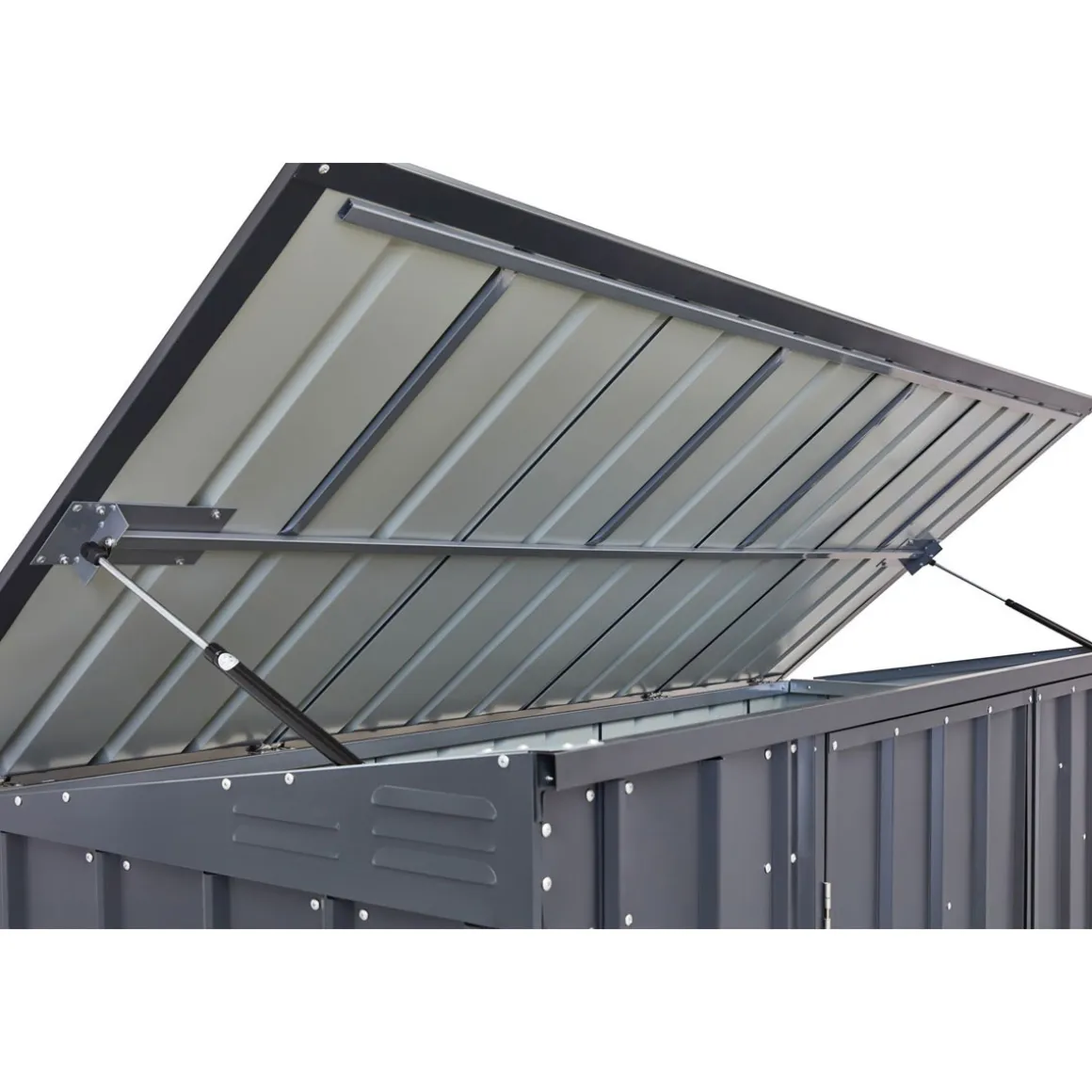 Die Vitavia Mülltonnenbox Easy 1,6m² in schwarz ist die ideale Lösung, um Ihre Mülltonnen sicher und ordentlich aufzubewahren. Mit einer Grundfläche von 1,62 m² bietet sie ausreichend Platz für zwei Tonnen mit einem Fassungsvermögen von je 240 Litern. Die Box ist abschließbar und besteht aus robustem Stahlblech mit einer Materialstärke von 0,3 mm.