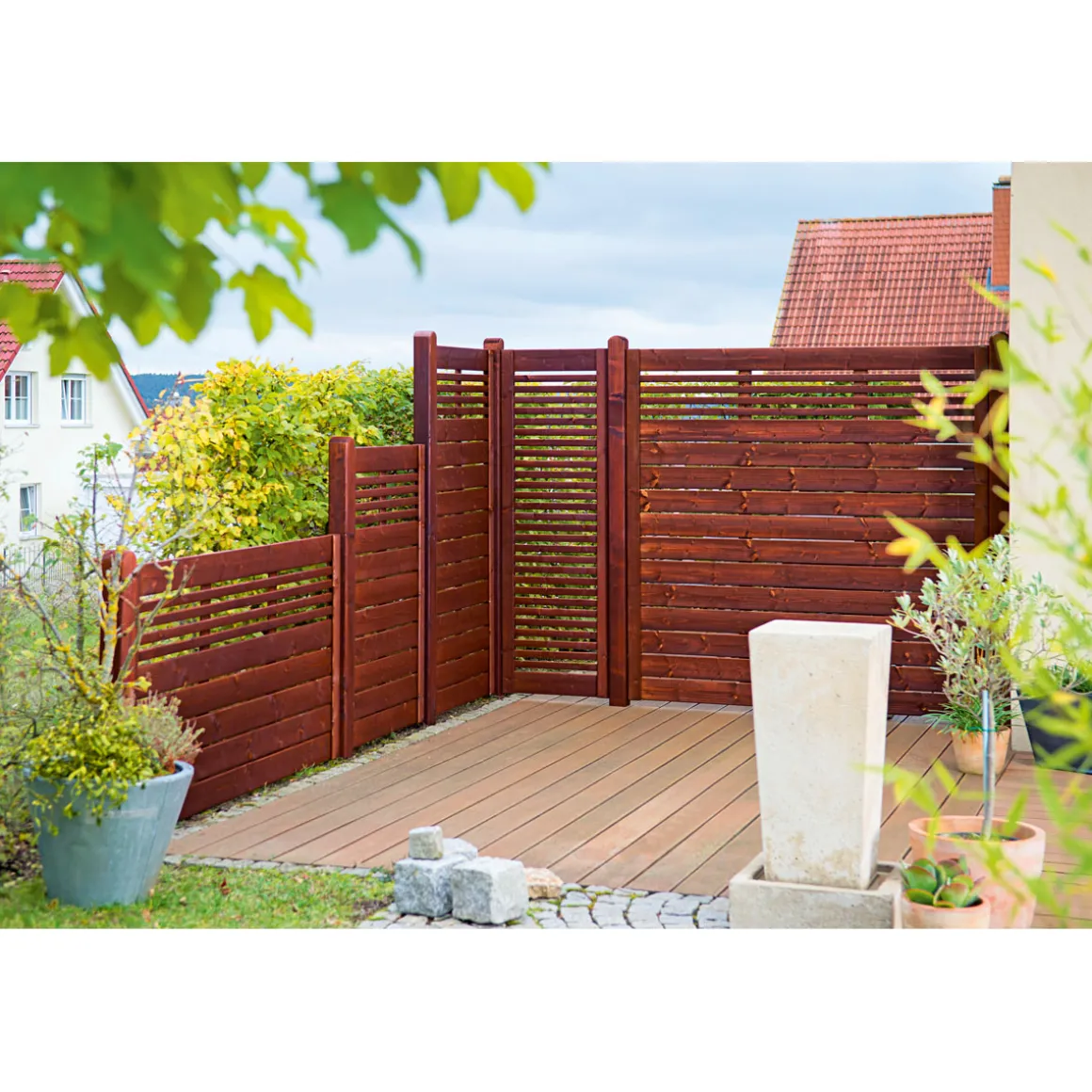 - Lamellen mit einer Stärke von 16×115 mm bieten hohen Sichtschutz